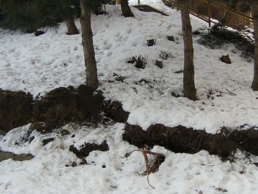 Následky revitalizace - obnažené kořeny zdravých stromů.