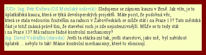 Na závěr za mě velká omluva místostarostovi Zemanovi. Začátkem týdne kdosi vyvěsil v okolí Amforové poutavé letáčky zvoucí na středeční setkání Radnice s občany. Vypadlo to jako hezké informační gesto od radnice směrem k obyvatelům. V úvodu jsem si dovolila lehký dotaz, zda za touto aktivitou stála sama Radnice (mile by mě to překvapilo). "Jestli si nějaký hlupák myslí, že skutečně mám zapotřebí lítat po svém bydlišti a vyvěšovat letáky na kandelábry, tak to skutečně nemám," reagoval místostarosta Zeman. Má pravdu ! Za touto aktivitou skutečně nestála Radnice, ale jak jsme se v závěru setkání dozvěděli, byli to naši aktivní spoluobčané. Radnici se za možnou spojitost s touto iniciativou opravdu upřímně omlouvám. Jsem opravdu hlupák, že jsem si to mohla byť jen na okamžik myslet.